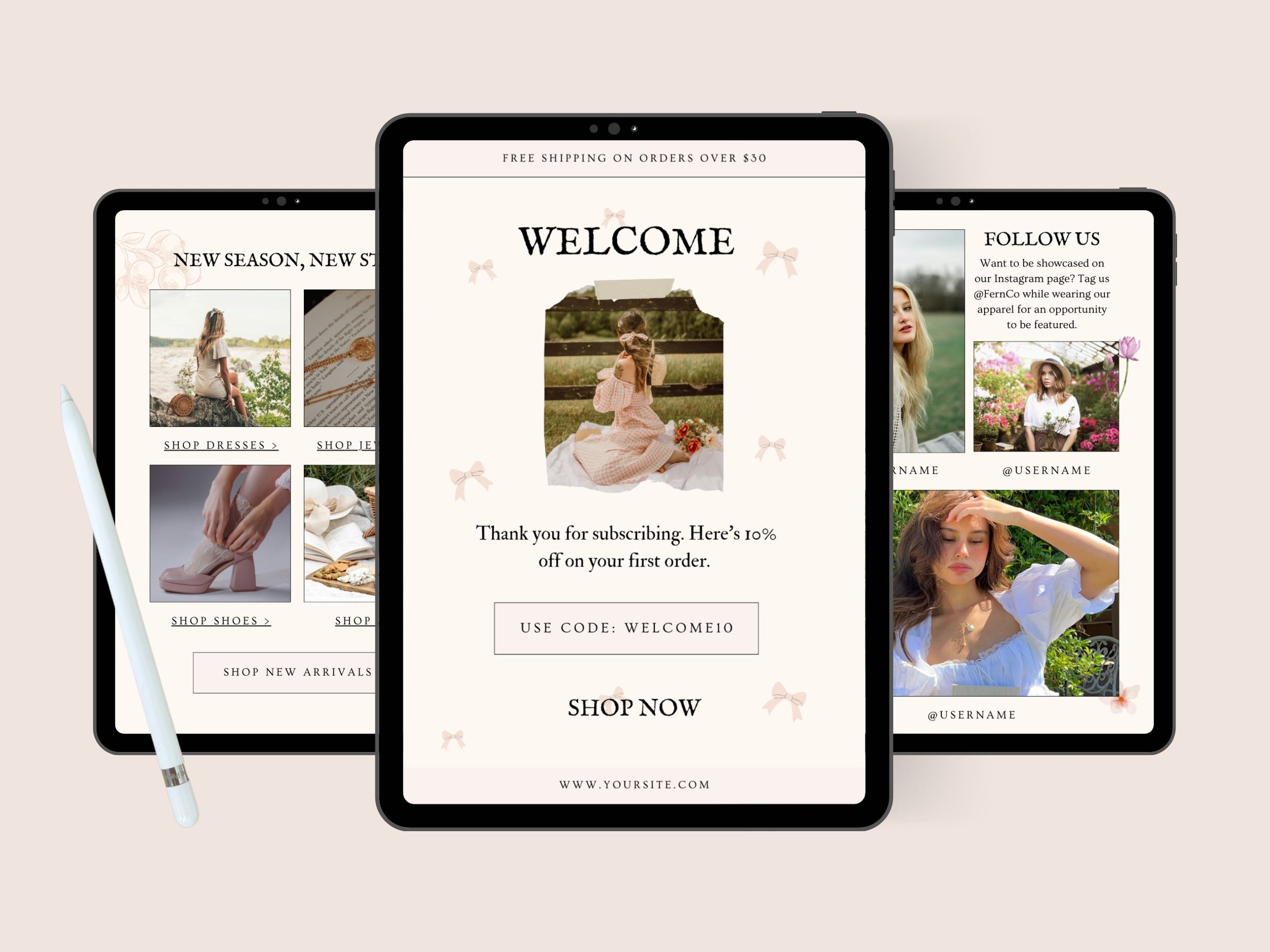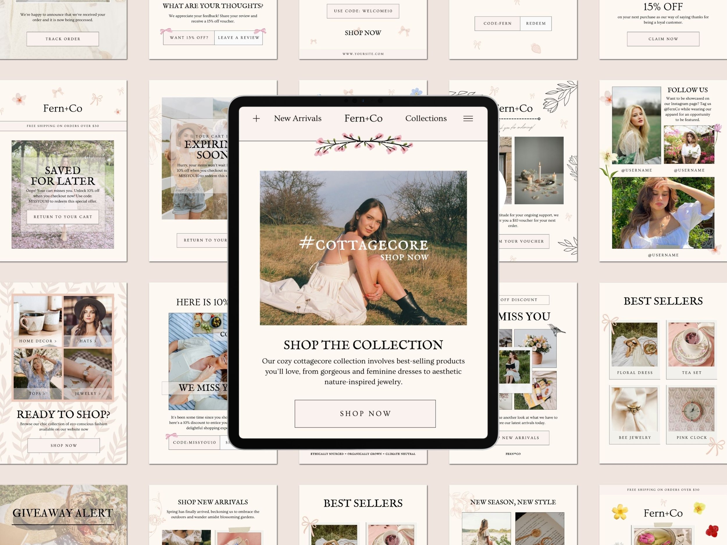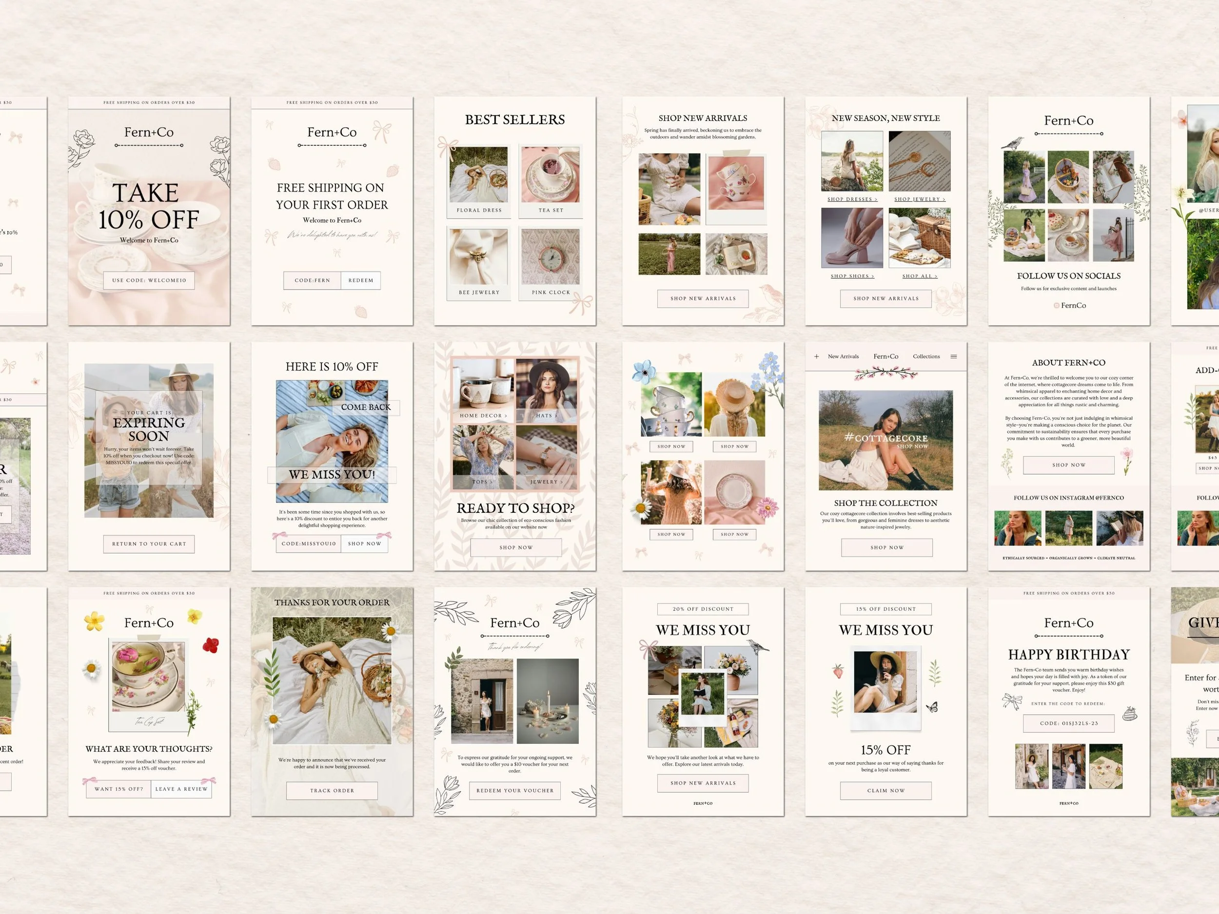 Developed brand identity, strategy, and a 26-page mix-and-match email marketing template pack for cottagecore e-commerce businesses. Templates offer a cohesive, on-brand aesthetic across Welcome Newsletters, Abandoned Cart, New Product Announcements, Review Requests, Birthday Emails, Winback campaigns, and more, allowing businesses to create versatile, visually appealing campaigns tailored to their audience.